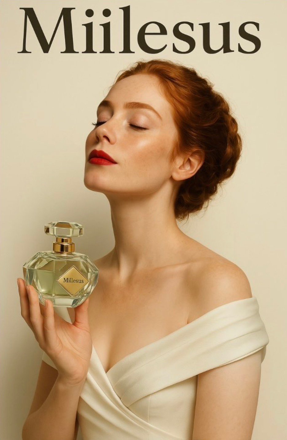 I will send you a photo of a woman and a perfume bottle. Please don’t change the woman’s face or the I will send you a photo of a woman and a perfume bottle. Please don’t change the woman’s face or the perfume bottle, but you can change her outfit. Using these visuals, I’d like you to create a perfume advertisement poster for a fragrance called “Miilesus.”