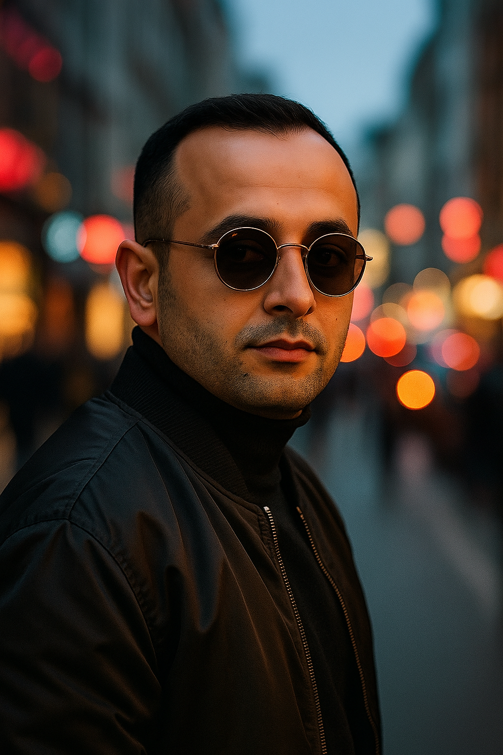 Dressed in a dark turtleneck and a loose black bomber jacket, he exudes cool confidence. The cityscape behind him is softly blurred-awash with colorful lights and out-of-focus pedestrians-creating a cinematic, moody depth-of-field effect.