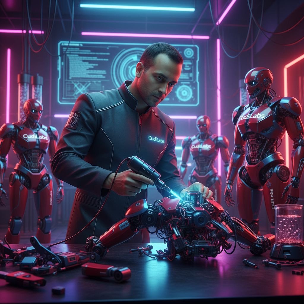 A hyper-realistic, cinematic 8K image of a scientist in a futuristic laboratory. The scientist, a man (use my uploaded photo for face reference), is wearing a sleek futuristic uniform with a prominent name tag that reads ‘CudiLabs’. The lab is filled with assembled, intricate red and blue robots, each clearly branded with the name ‘CudiLabs’. The man is actively checking and working on one of the robots using his high-tech tools. The scene is illuminated by dramatic futuristic neon lights, creating an intense, high-tech atmosphere with a strong futuristic vibe in the background.