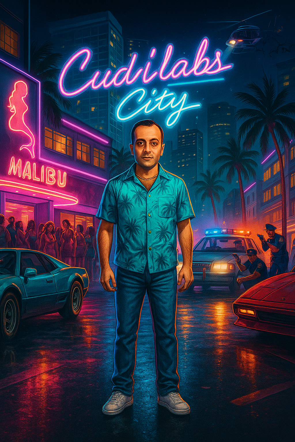 In the background, another huge neon sign in Vice City font style (retro pink-and-blue glow) displays the words ‘CudiLabs City’. The whole scene is hyperrealistic, cinematic, with strong neon reflections on wet asphalt, ultra high resolution, perfectly capturing the Vice City vibe.