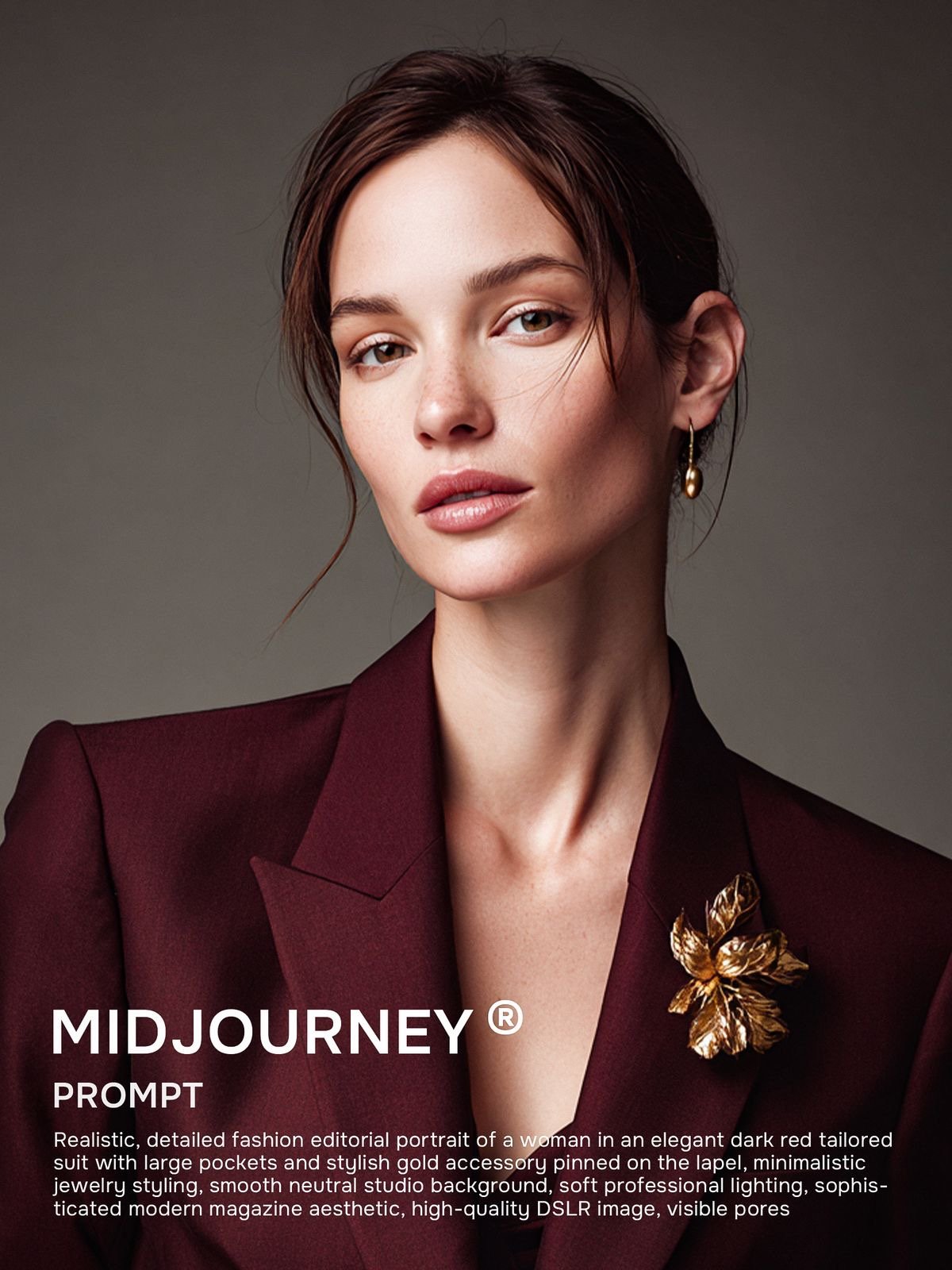 Realistic, detailed fashion editorial portrait of a woman in an elegant dark red tailored suit with large pockets and stylish gold accessory pinned on the lapel, minimalistic jewelry styling, smooth neutral studio background, soft professional lighting, sophisticated modern magazine aesthetic, high-quality DSLR image, visible pores.