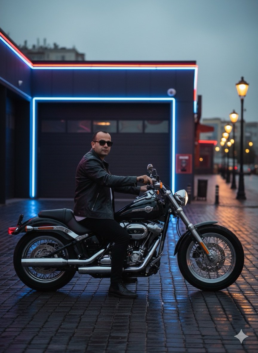 Full-length shot, eye contact, man sitting on the motorcycle, side shot, evening in front of a motorcycle garage (with neon lights) with street lights around.
