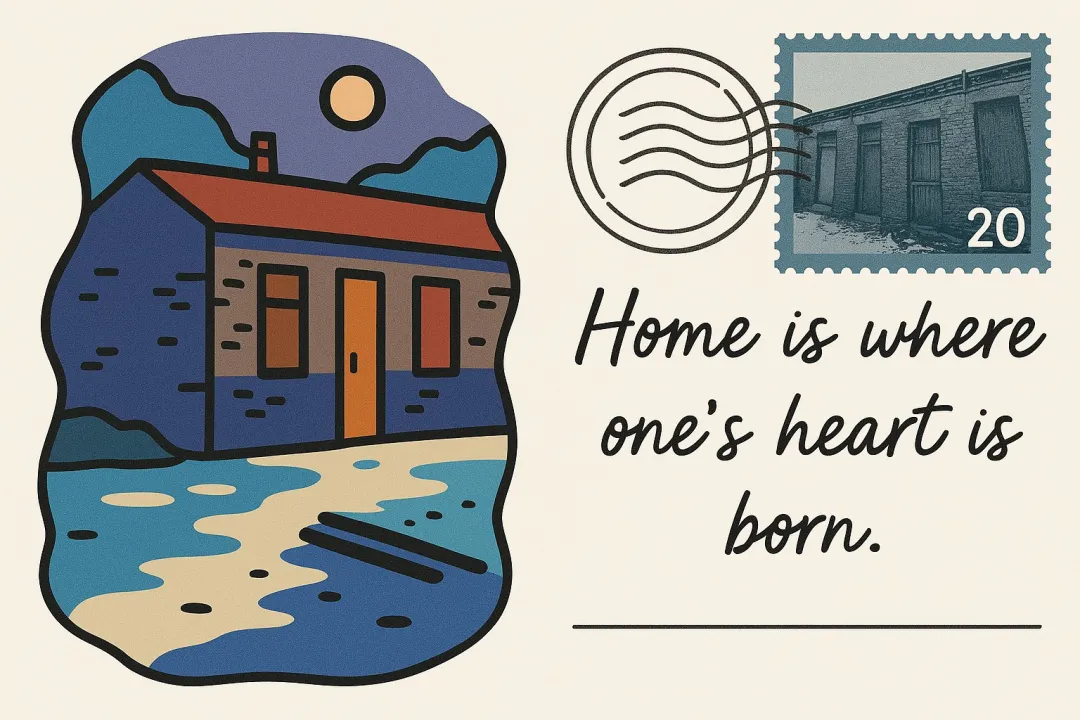 Help me make this photo into a 3:2 postcard. On the left is a flat multi-color illustration style (refer to a certain picture). The content of the illustration refers to this photo, such as: architecture/landscape/characters and other details. Please make an irregular border on the edge of the illustration. On the right, write a famous saying related to “XX” in English by hand, and attach a monochrome style stamp generated by the original picture. In the upper right corner of the stamp, the stamp is written in XXXX and stamped with the postmark.