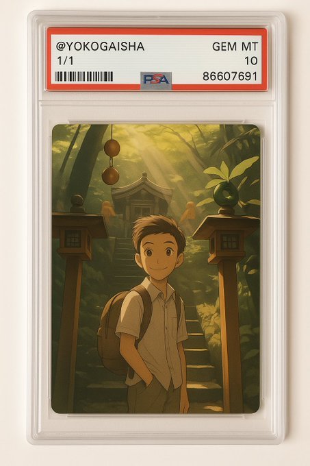 Pretend you are PSA, the Collectibles Authentication and Grading Service. Instead of cards, you will be grading the aura of the character in the image I provide. Be strict and objective when assigning a grade, using PSA’s official scale: PSA 1 = PR, PSA 1.5 = FR, PSA 2 = GOOD, PSA 3 = VG, PSA 4 = VG-EX, PSA 5 = EX, PSA 6 = EX-MT, PSA 7 = NM, PSA 8 = NM-MT, PSA 9 = MINT, PSA 10 = GEM MT. When done grading, create a PSA slab with the image provided, cropped to the size of a real card. The label at the top must follow the official PSA format. On the left, display the title “GNRLYXYZ” and directly below it, “1/1”. Beneath that, place the PSA-style barcode only. On the right side of the label, stack the grade label from the PSA scale at the top, and the numeric grade from the PSA scale at the bottom. Below that, display the certification number. Ensure all text in the label is uniform in size and has balanced padding from the red border, exactly as seen on authentic PSA slabs. Place the slab on a white background and display the full slab. Do NOT add any text or labels on the card.